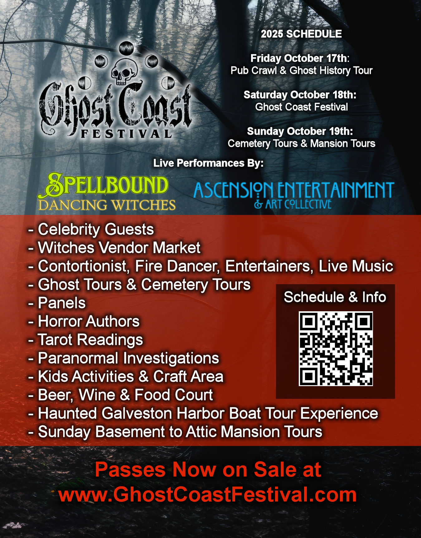 The Ghost Coast Festival is a family friendly event that will be held at the League Kempner Mansion October 17th – 19th, 2025 and will include a vendor market, panels, speakers, paranormal investigations, ghost tours, psychic readings, kids activities, entertainment and much more!